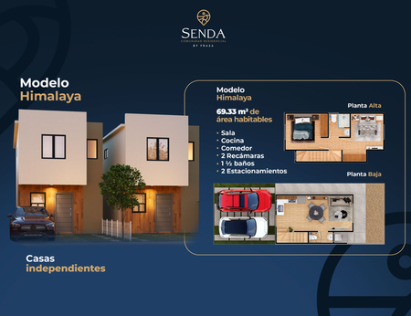 Modelo Himalaya – 69.33 M2 Casas independientes, con 2 recámaras y 1.5 baños. Pasillo de servicio y estacionamiento para 2 autos. La opción más amplia, ideal por su comodidad y amplitud.