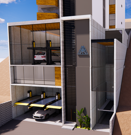 Estacionamiento con elevador de autos y salida eléctrica de 220V para carga de vehículos eléctricos.