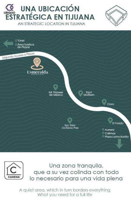 Esmeralda Residencial de Casas Cadena te ofrece una ubicación estratégica en Tijuana, en una zona tranquila con acceso a todo lo que necesitas para una vida plena; Plazas, Escuelas, Fabricas, Farmacias, Supermercados y mucho más.