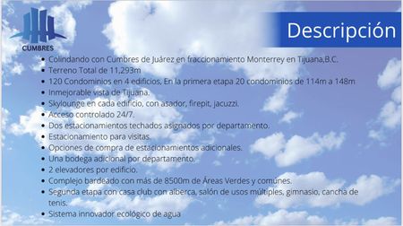 Esta es tu oportunidad de vivir en una de las zonas de mayor plusvalía en Tijuana, donde la comodidad y el lujo se unen en un entorno excepcional. Con un total de 120 condominios distribuidos en 4 edificios en su primera etapa, disfrutarás de una vista incomparable de la ciudad.